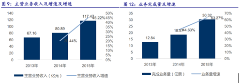 注: 因?yàn)轫権S在最新年報(bào)中沒(méi)有給出詳細(xì)的國(guó)內(nèi)快遞業(yè)務(wù)(時(shí)效產(chǎn)品)的件量數(shù)量。只給了一個(gè)總體25.8億票和31%的增速,前后口徑應(yīng)不同,所以2016年份額反增加。但不影響結(jié)論。若按2015年占比為8.22%,若16年件量增速31% ,份額實(shí)際已降至1.31/1.5*8.22%=7.1%左右。