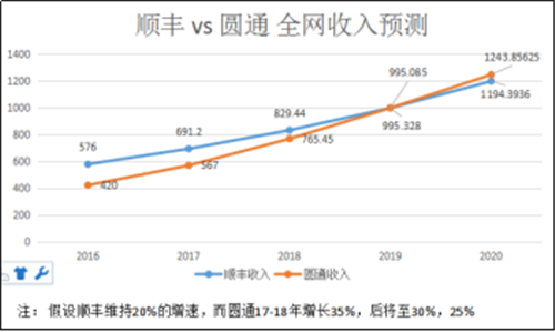 順豐全網(wǎng)收入份額一度達(dá)20%。但隨著增速落后逐年下滑,很可能要失去老大地位。圓通申通單票運(yùn)費(fèi)是順豐的1/2,只要件量是順豐的2倍。就有可能超過(guò)順豐。2016年2月圓通老板娘張小娟在杭州兩會(huì)上透露圓通2015年總件量約35億件(實(shí)際30億票),全網(wǎng)營(yíng)收350億元(實(shí)際可能為300億元)。根據(jù)圓通發(fā)布的業(yè)績(jī)預(yù)告,2016年件量和收入都大于40%的增長(zhǎng)。全網(wǎng)收入可能超420億元。假若保持這種趨勢(shì)下去,圓通甚至中通、申通等都可能在接下來(lái)三五年內(nèi)在全網(wǎng)收入上超越順豐, 甚至比順豐提早突破千億大關(guān)。順豐可能掉至三四名甚至更后。