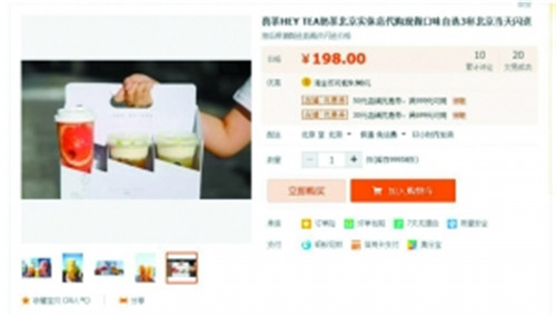 北京市場已有淘寶商家專門做起喜茶代購的服務(wù)。北京商報記者在一家提供喜茶代購服務(wù)的網(wǎng)店中注意到,代購一杯喜茶的跑腿費用報價為66元,3杯起送,即一次代購產(chǎn)生的跑腿費用至少為198元。