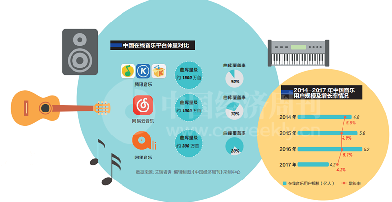 2016年7月,QQ音樂(lè)與酷我音樂(lè)、酷狗音樂(lè)并入騰訊音樂(lè)旗下后,騰訊開始對(duì)數(shù)字音樂(lè)版權(quán)著重布局。2017年3月和5月,騰訊音樂(lè)先后拿下中國(guó)大陸地區(qū)對(duì)環(huán)球音樂(lè)所擁有的音樂(lè)詞曲獨(dú)代權(quán)和數(shù)字版權(quán)分銷權(quán),并為此付出了3.5億美元現(xiàn)金及購(gòu)買環(huán)球音樂(lè)1億美元期權(quán)的代價(jià)。“截至目前,全球范圍內(nèi)有200多家唱片公司持有數(shù)字音樂(lè)的版權(quán),目前90%以上都已經(jīng)被騰訊拿下?!币晃痪W(wǎng)易云音樂(lè)內(nèi)部人士告訴《中國(guó)經(jīng)濟(jì)周刊》記者,騰訊音樂(lè)目前擁有的版權(quán)數(shù)量、廣度和對(duì)版權(quán)的投入都是業(yè)內(nèi)第一,其中不少是“獨(dú)家代理權(quán)”,相當(dāng)于緊緊地扎起了一個(gè)籬笆。