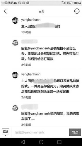 “你到時(shí)候把商品的鏈接給我,然后就是你的收貨地址,每件商品你要給我2塊錢的押金,到了11號那天,我來幫你搶東西,然后付款,沒搶到的話我會退押金,搶到的東西會直接由賣家郵給你,我把交易成功的截圖發(fā)給你之后,你給我付尾款就行了?!边@位出租“購物車車位”的商家說,之所以每件商品需要支付2元的押金,是為了防止違約。