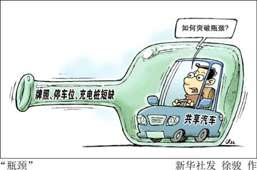 牌照、停車位、充電樁成為制約共享汽車行業(yè)發(fā)展的三大瓶頸,需要各方協(xié)同創(chuàng)新以促進產(chǎn)業(yè)可持續(xù)發(fā)展。新華社發(fā) 徐駿/作