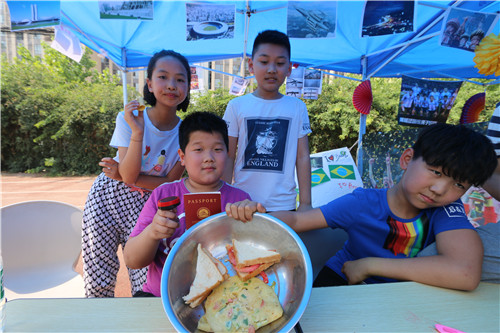不要以為拿著護(hù)照,在校園里隨意的蹭吃蹭喝蹭表演看,這個(gè)國際周就算圓滿了。一帶一路“自助游”的路線是這樣的:首先要在教室里,認(rèn)真學(xué)習(xí)和了解“一帶一路”沿線國家的靜態(tài)文化展示;接著去操場和報(bào)告廳體驗(yàn)國家的動(dòng)態(tài)文化展示——美食、舞蹈、音樂等民俗文化;最后去簽證官處“面簽”,想要拿到簽證絕非易事,還得回答“簽證官”提問的問題,如“看我們的國旗,我們是哪個(gè)國家的?”“我們國家什么最著名呀?”等問題,而問題的答案,都在孩子們精心準(zhǔn)備的文化展板里。如果你被簽證官“拒簽”,那么請(qǐng)你再去學(xué)習(xí)深造一下。你瞧,孩子們可不覺得這是一場游戲,而是把這看出是一堂課程、一次學(xué)習(xí),一次檢驗(yàn)自己知識(shí)儲(chǔ)備的考試。當(dāng)孩子們集齊所有國家的簽證,那么學(xué)校會(huì)有神秘的兒童節(jié)禮物獎(jiǎng)勵(lì)你。