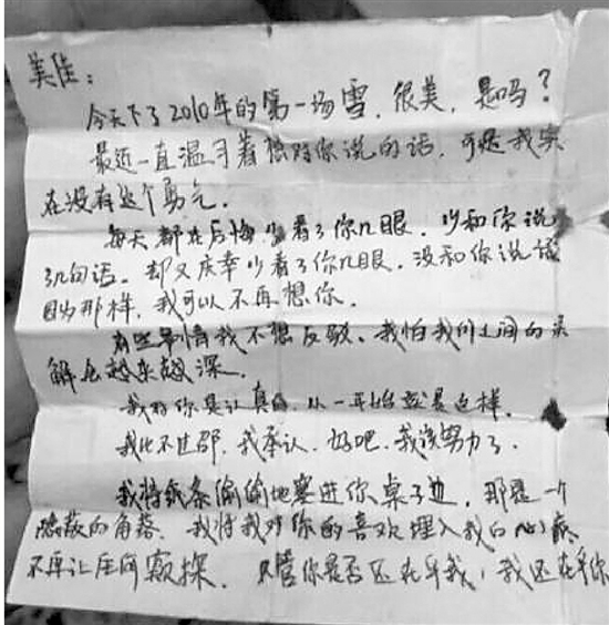 情書的紙張已經(jīng)泛黃、破損,是2010年第一場雪的那天,寫給一個(gè)叫“美佳”的人。