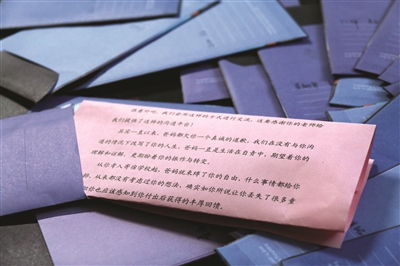 而最棘手則是一些父母與孩子之間有一些矛盾,“我們班一個(gè)男生因?yàn)楦咧袝r(shí)候爸媽管他管得太緊,以至于跟他們之間產(chǎn)生了很大的矛盾,他的父母知道有這樣一個(gè)可以給孩子寫信的機(jī)會(huì)之后,雖然很高興,但是也憂心忡忡,害怕孩子不愿意看他們的信,或者會(huì)因?yàn)檫@封信措辭不合適而加深對(duì)他們的誤解。我開導(dǎo)了他們很久,他們才愿意寫一封信,希望可以解開這個(gè)心結(jié)?!标惱蠋煴硎荆@位同學(xué)的父母寫的信更像是一封和解信,在字里行間的深深愧疚中,她也感受到了家長(zhǎng)對(duì)于孩子的無奈和那一顆期望孩子快樂的心。