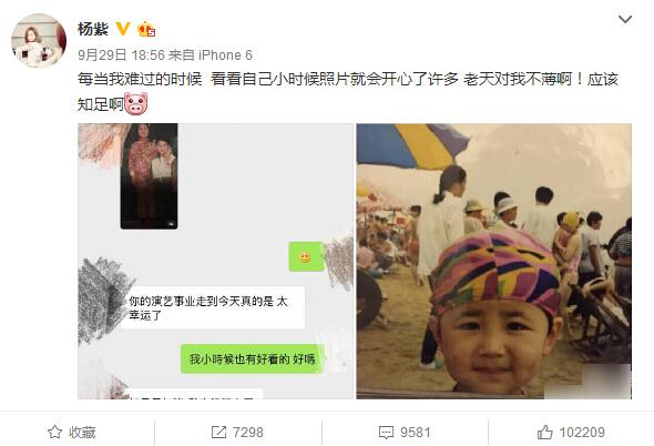 9月29日,楊紫曬出兩張照片,一張為聊天的截圖,一張為楊紫小時候的照片,楊紫寫道:“每當我難過的時候,看看自己小時候照片就會開心了許多。老天對我不薄??!應該知足啊?!?/p>