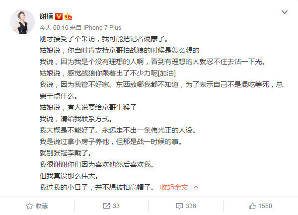 謝楠澄清養(yǎng)吳京言論:是戰(zhàn)狼1的事,不想被扣高帽子