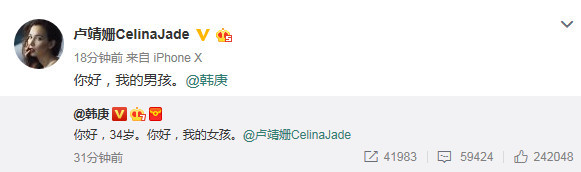 韓庚微博公布戀情,盧靖姍轉發(fā)回應