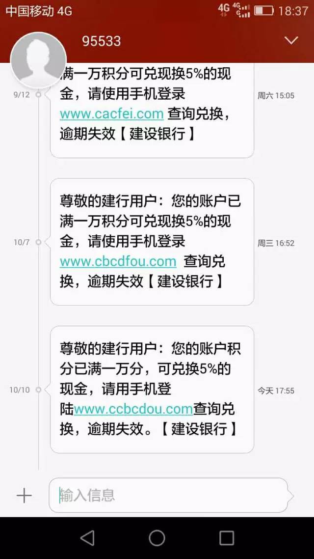 警惕!近期有市民報(bào)料稱,自己連續(xù)收到了銀行發(fā)來的短信,說自己可以憑積分兌換現(xiàn)金。短信里提供的鏈接打開后,就是“銀行網(wǎng)站”。