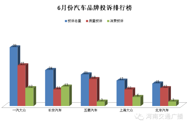 2015年6月份,河南交通廣播《1041維權(quán)直通車》接到汽車投訴418起,本次投訴排行榜上海大眾首次退出了“前三甲”,但一汽大眾仍然一馬當(dāng)先。