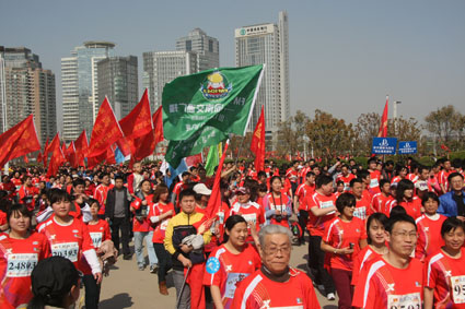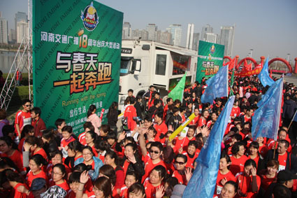 3月27上午,綠城鄭州陽光明媚,春意盎然,2011年中國鄭開國際馬拉松賽分別在鄭州市鄭開大道和鄭東新區(qū)商務(wù)內(nèi)環(huán)鳴槍舉行,來自28個國家和地區(qū)的近3萬名選手參加了比賽。河南交通廣播也組織了由1041名車友組成的“千人跑友團”參賽,大家一起跑進春天,共同慶祝交通廣播成立18周年。