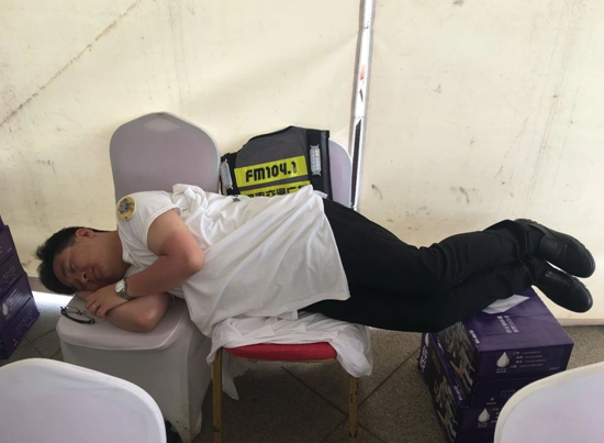 為了保證大家順利進(jìn)園,《南方談交通》的主持人劉翔第一天就被曬傷了,間隙時間,拼出來兩個凳子就瞬間睡著。