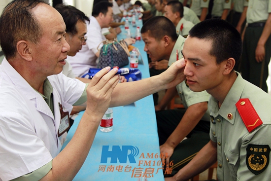 活動(dòng)中,10名河電臺(tái)信息廣播的熱心聽(tīng)眾作為軍民共建的代表,跟隨醫(yī)療專(zhuān)家來(lái)到軍營(yíng),為武警官兵送上了10箱涼茶消暑。隨后,15名武警河南總隊(duì)醫(yī)院骨科、眼科等科室的專(zhuān)家為子弟兵們進(jìn)行了義診。