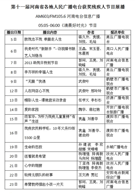 自2014年5月5日起,河南省“第十一屆各地人民廣播電臺(tái)殘疾人節(jié)目展播”活動(dòng)中評(píng)選出的優(yōu)秀廣播節(jié)目將在AM603、FM105.6河南人民廣播電臺(tái)信息廣播《清晨好時(shí)光》節(jié)目中陸續(xù)播出。