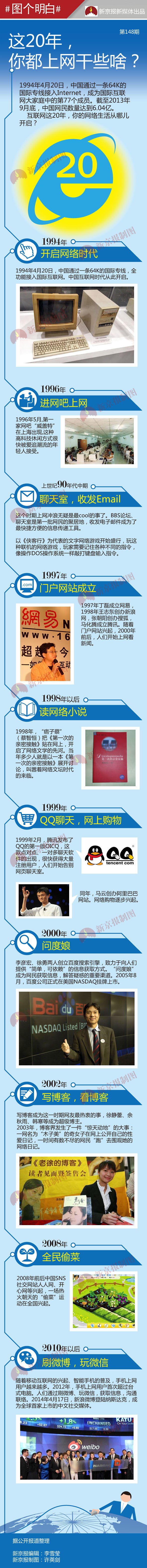 1994年4月20日,中國(guó)通過(guò)一條64K國(guó)際專線接入Internet,成為國(guó)際互聯(lián)網(wǎng)大家庭中的第77個(gè)成員。截至2013年9月底,中國(guó)網(wǎng)民數(shù)量達(dá)到6.04億?;ヂ?lián)網(wǎng)這20年,你的網(wǎng)絡(luò)生活從哪兒開(kāi)啟?