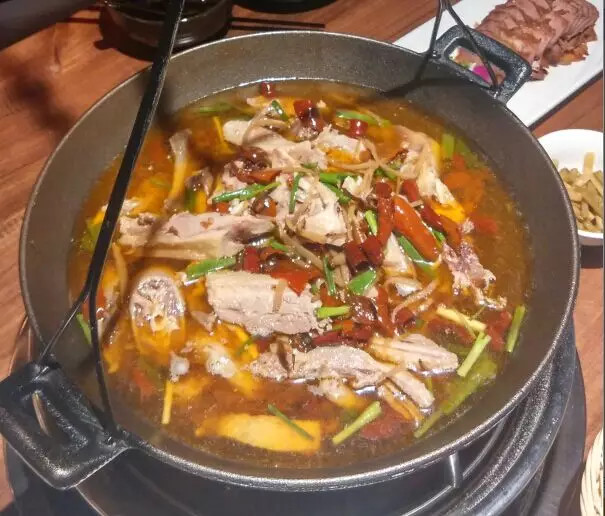 這鍋也不是普通鍋,必是生鐵的才好,一是厚重,鍋不會(huì)亂動(dòng),二是健康,補(bǔ)鐵補(bǔ)血,比廣告強(qiáng)。鍋內(nèi)放信陽(yáng)老燉菜,老公雞、排骨、豬蹄、鵝塊,時(shí)間越久越有味。如果是冬天,“新醅酒,小火爐,天欲雪,一杯無”意境太贊,要是夏天,“炭火燒,大汗淌,赤膊上,可勁浪”,警察叔叔也管不著~~
