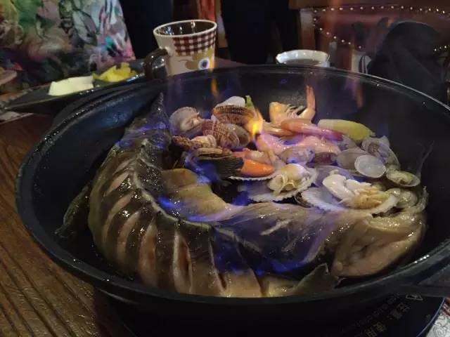 以魚、扇貝、大蝦和時(shí)蔬為鍋底,先燜制,后以米酒澆鍋,點(diǎn)火后,能看到火焰在食材上跳躍,聞到淡淡的酒香,最后的醬料可以拌意面吃,有黑椒、麻辣和酸菜三種口味。