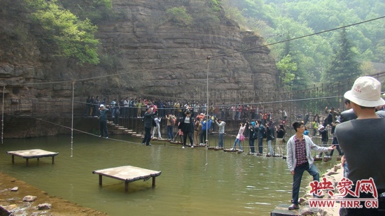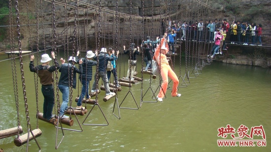 盡管鄭州的天氣忽冷忽熱還時不時的狂風(fēng)大作,但是在這里天氣卻晴朗明媚,溫度也正好適宜外出游玩。當(dāng)然,玩的嗨才是最關(guān)鍵的!景區(qū)內(nèi)除了誰都不會錯過的風(fēng)景名勝外還有很多有趣的娛樂項目:比如過吊索:看起來簡單的吊索其實需要有很好的體力和身體協(xié)調(diào)力,一不留神就可能狼狽的掉入半米深的池水中。還有劃沖鋒舟,非常考驗團隊的協(xié)作。不過最好玩的卻是在大巴車上,“樂活”的工作人員們把最自己具特色的電臺節(jié)目“知道不知道”搬上了大巴車,并邀請了電臺的明星主持亞楠來與大家互動,把無聊的旅途變得趣味橫生。