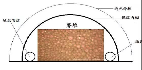 由塑料大棚外棚和內(nèi)部保溫棚組成,利用透光外棚獲取太陽能熱量為薯堆加溫,內(nèi)棚用保溫材料覆蓋,在夜間能夠保持薯堆熱量,可用通風(fēng)管道對內(nèi)棚進行補充新鮮空氣與熱量交換,達到安全越冬的目的。在貯藏初期氣溫偏高,讓薯堆風(fēng)吹日曬10-15天進行自然愈合,提高貯藏的安全系數(shù)。