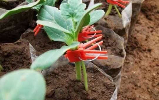 多采用頂插接法,以西瓜子葉呈“丫”字形到展平期為嫁接適期。嫁接時先用刀片削去砧木真葉及生長點(可在嫁接前2~3天摘除,促進下胚軸增粗,有利于提高嫁接成活率和操作方便),然后用竹簽順子葉連線方向下斜插入砧木胚軸,深約0.5~1㎝。(注意:竹簽尖端達到子葉下胚軸的另一側皮層,頂在該部位的手指有觸感時為宜)。取出接穗,用刀片在子葉下1~1.5㎝處斜削,使之或“十” 形,隨后迅速拔出砧木中的竹簽,將接穗準確地按竹簽插入方向,斜插入砧木孔中。接好后接穗的子葉方向與砧木的子葉成“十”子形交叉。