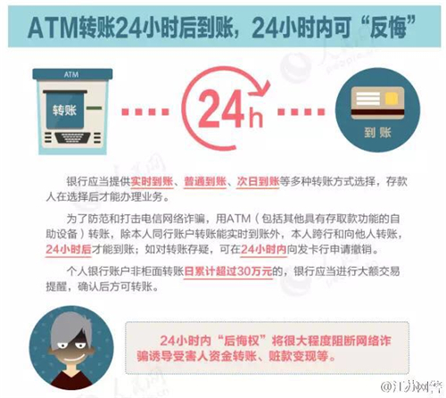 12月1日起,一批銀行新規(guī)開始實行,其中最引人矚目的一條,則是通過ATM機轉(zhuǎn)賬,由原來的實時到賬改為默認(rèn)24小時后到賬,24小時內(nèi)可撤銷轉(zhuǎn)賬操作,這等于給消費者提供了一?!昂蠡谒帯?,也能從一定程度上防止電信詐騙。