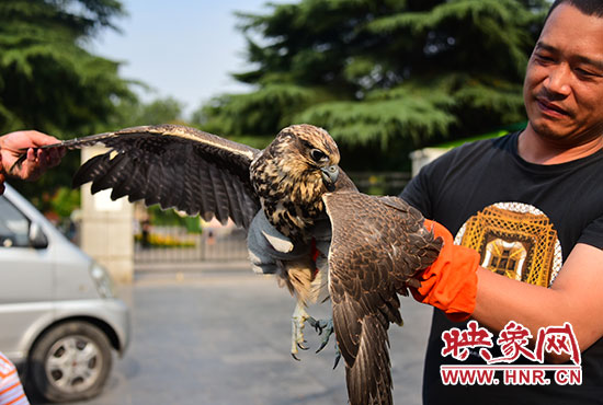 中牟縣林業(yè)局接到警方的電話后,工作人員冉占杰、朱鑫驅(qū)車趕到現(xiàn)場(chǎng),卻也沒(méi)有認(rèn)出該鳥的鳥名。工作人員將大鳥帶回單位后,進(jìn)行喂水喂食。隨后,他們將圖片發(fā)至鄭州市林業(yè)局野生動(dòng)物救護(hù)站。董朝偉站長(zhǎng)認(rèn)出:它非同小可,竟然是國(guó)家二級(jí)重點(diǎn)保護(hù)動(dòng)物,蒙古國(guó)國(guó)鳥,珍稀而罕見的獵隼。