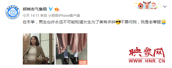 然而,就在記者發(fā)文前“鄭州市氣象局”的最后一篇微博中,氣象局小編面對完全不配合的暴雪,已徹底棄療,不再談?wù)撊魏闻c雪有關(guān)的話題,反而談?wù)撈鹋灾b,甚至把自己“老寒腿”的秘密也共享給大家。