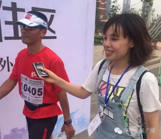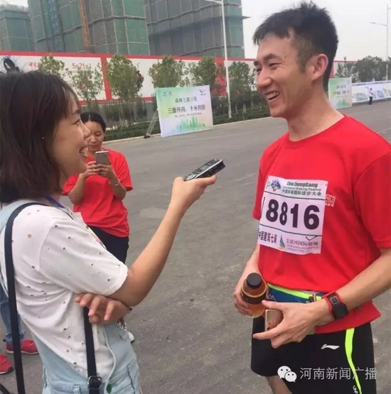 僅僅過(guò)了2小時(shí)20分,終點(diǎn)迎來(lái)第一位沖向終點(diǎn)的高先生,氣喘吁吁的他在接受我們采訪時(shí)依然腳步穩(wěn)健。