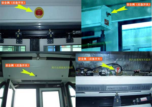 公交車的車門上方配有一個車門開啟安全閥,此安全閥在車輛斷電、斷氣的情況下也可以打開車門。離門近的乘客只要將此安全閥旋轉(zhuǎn),然后手動將門打開下車即可。