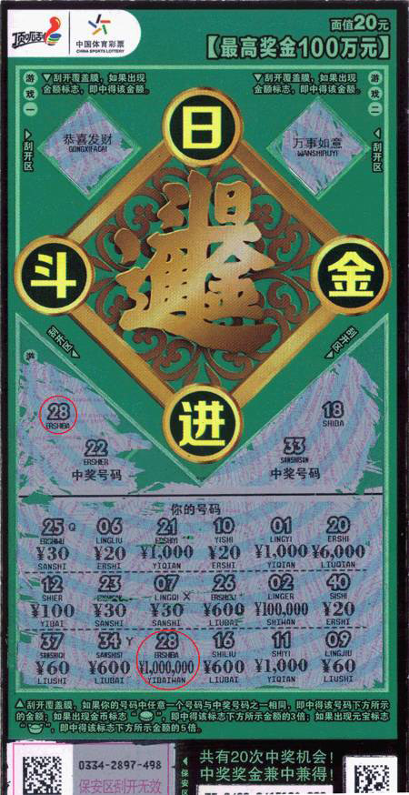 “日進斗金”面值20元,共有三個游戲。游戲一和游戲二,刮開覆蓋膜,如果出現(xiàn)金額標志,即中得該金額;游戲三:刮開覆蓋膜,如果你的號碼中任意一個號碼與中獎號碼之一相同,即中得該號碼下方所示的金額;如果出現(xiàn)銅錢標志,即中得該標志下方所示金額的3倍;如果出現(xiàn)元寶標志,即中得該標志下方所示金額的5倍。