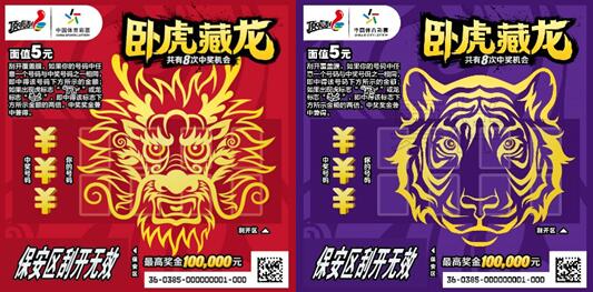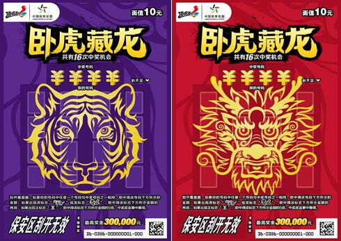 本次上市的“臥虎藏龍”主題即開套票,共有5元、10元、20元三種面值。票面設(shè)計(jì)色彩濃郁、霸氣美觀,“虎頭”、“龍頭”標(biāo)識躍然于票面正中,“眼神”犀利且極富“挑戰(zhàn)”意味,寓意充滿自信,敢于挑戰(zhàn)最高獎金。