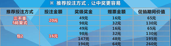 贈票活動不限投注方式,單式、復(fù)式、組合如中獎(jiǎng)均可贈票。采用復(fù)式組合投注,獎(jiǎng)金有可能會翻2倍、3倍或4倍,是真正的獎(jiǎng)金會翻倍的彩票,尤其是現(xiàn)在活動升級,贈票金額翻倍,獎(jiǎng)金更高更超值。