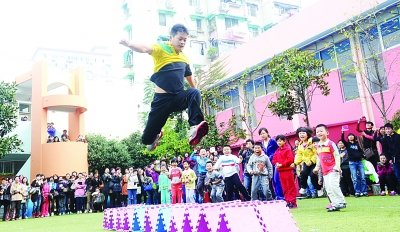 幼兒園男老師縱身一跳,跳過12個障礙墊,令在場的孩子們興奮地尖叫。