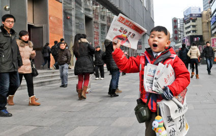 出了站,多多繼續(xù)向周圍的人推銷。成功賣掉一份報(bào)紙,多多很開心,向不遠(yuǎn)處的媽媽喊上一聲,“我又賣掉了一份!”一位身著黃色衣服的中年人很同情多多,對(duì)他說:“天太冷了,我把你的報(bào)紙全買了。”雖然付了10塊錢,但他只拿了3份報(bào)紙。據(jù)統(tǒng)計(jì),昨天,多多在新街口一帶“吆喝”了一個(gè)多小時(shí),共賣出29份報(bào)紙。