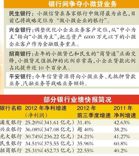 其中一個重要的對手將是興業(yè)銀行。興業(yè)銀行昨日披露,2013年,興業(yè)銀行積極調(diào)整優(yōu)化小企業(yè)業(yè)務客戶定位、經(jīng)營戰(zhàn)略和發(fā)展目標,將總資產(chǎn)6000萬元以下的小微企業(yè)客戶作為金融服務重點,并配套實施一系列體制機制改革措施和投入資源保障,全面推進小微企業(yè)金融服務升級。