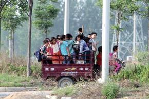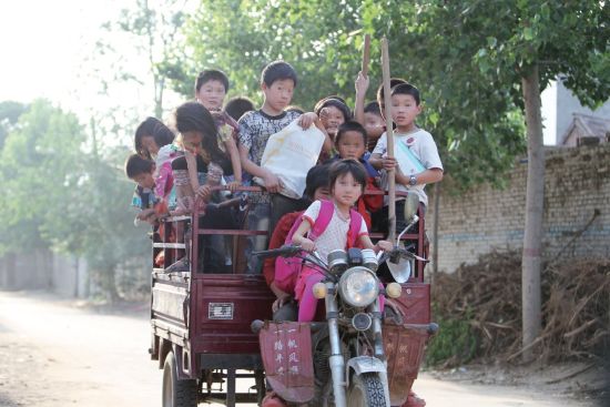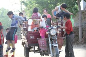 三輪摩托車開進(jìn)鄭開大道南邊的一個(gè)村子停了下來(lái)。此時(shí),我才發(fā)現(xiàn)真正在駕駛?cè)喣ν熊嚨氖且晃恢心陭D女,那個(gè)貌似在開車的小女孩就坐在三輪摩托車的油箱上。為了看清道路,中年婦女不得不歪著腦袋開車。車子停下時(shí),車上的孩子們紛紛跳下車向家中跑去。