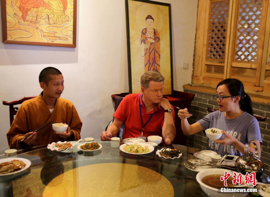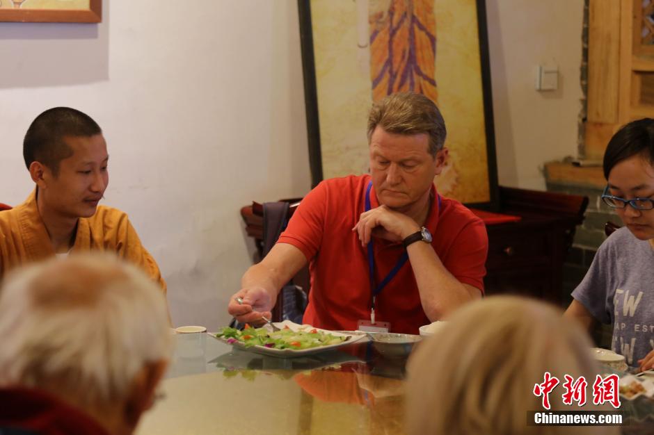 9月20日,河南登封少林寺,立陶宛前總統(tǒng)、現(xiàn)歐盟議員、國際特技飛行員羅蘭達斯·帕克薩斯與參加2015鄭州航展的明星隊員們參訪少林寺。羅蘭達斯在少林寺里吃齋飯。中新社發(fā) 王中舉 攝