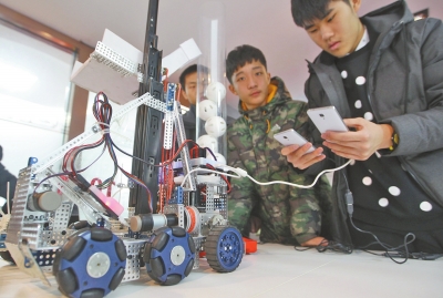 據(jù)鄭州二中PRCC科技代表隊指導(dǎo)老師吳鵬起介紹,比賽時,機器人們要從不同方向進入賽場,通過撞擊將球撞下來,然后“搶著”收球,并放入不同高度的球桶內(nèi),再將球桶推至固定區(qū)域。最終,得分最高者獲勝?!拔覀兊臋C器人的動作流暢自如。外國裁判說我們的設(shè)計完美,非常棒”!(記者 譚萍文 許俊文/攝影)