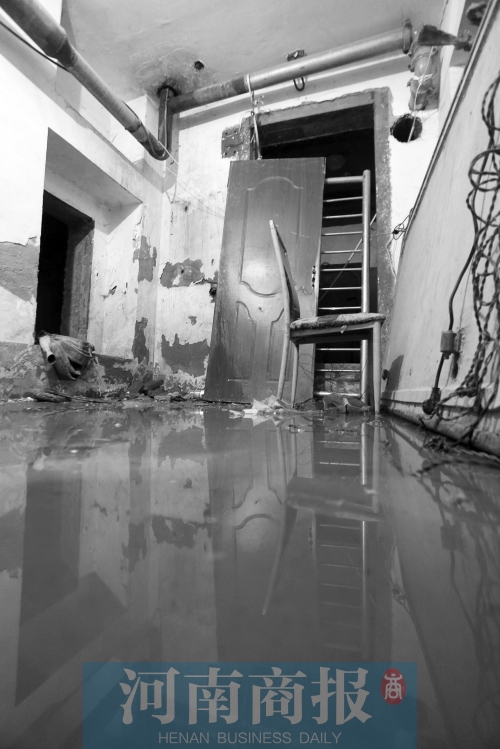 在負(fù)一樓,潮氣更重,地面上橫七豎八地?cái)[放著很多雜物,循著滴水聲向上看,一節(jié)生銹的水管道外壁上沾滿了水珠,水珠不停地往下滴。地面一側(cè)便是電梯井,記者打開燈照進(jìn)去,發(fā)現(xiàn)里面還有一些積水。