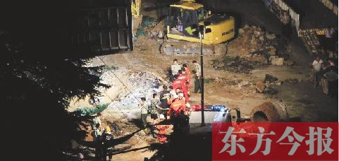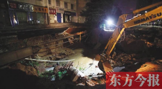 昨日21:26許,現場調來一輛挖土機,開始路面開挖施救。據市政部門介紹,塌方約600平方米,長約30米、寬約20米,深四五米。