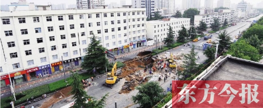 8月1日傍晚,鄭州市西郊普降大雨。19點30分左右,鄭州市中原路與文化宮路交叉口東50米路北處隔離花壇在暴雨中塌方,一株高20米、直徑35厘米的雪松隨暴雨塌入坑中。
