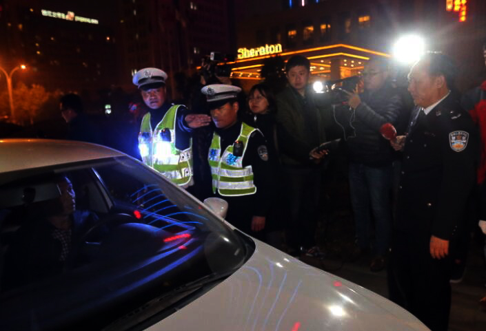▲11月16日晚,河南省公安廳交警總隊(duì)總隊(duì)長馮國文(右一)帶隊(duì)查酒駕。