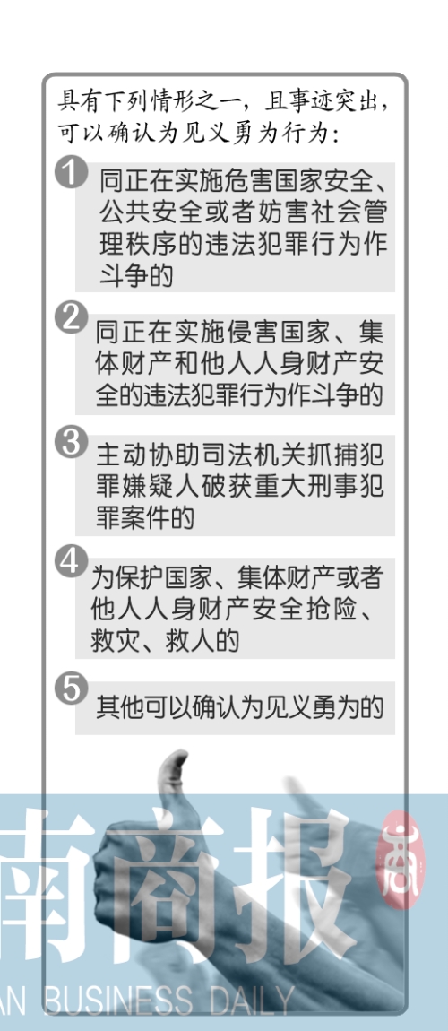 河南商報記者注意到,這次《意見稿》提到,對見義勇為人員可以給予的獎勵,包括嘉獎、頒發(fā)獎金、授予榮譽稱號以及其他獎勵。