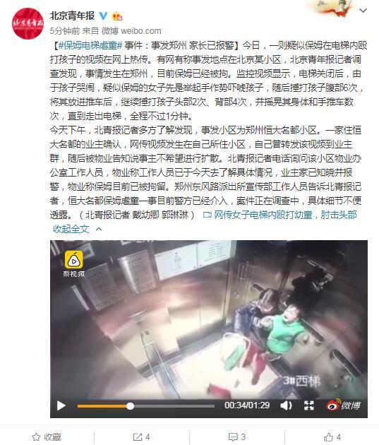 今日,一則疑似保姆在電梯內(nèi)毆打孩子的視頻在網(wǎng)上熱傳。有網(wǎng)有稱事發(fā)地點(diǎn)在北京某小區(qū),北京青年報(bào)記者調(diào)查發(fā)現(xiàn),事情發(fā)生在鄭州,目前保姆已經(jīng)被拘。監(jiān)控視頻顯示,電梯關(guān)閉后,由于孩子哭鬧,疑似保姆的女子先是舉起手作勢嚇唬孩子,隨后捶打孩子腹部6次,將其放進(jìn)推車后,繼續(xù)捶打孩子頭部2次、背部4次,并搖晃其身體和手推車數(shù)次,直到走出電梯,全程不過1分鐘。