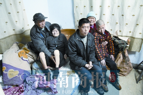 其中一名男子叫姜振友,駐馬店新蔡縣人。30日上午,留下身體健康的女兒在家看門,他和家人來(lái)到鄭州。他說(shuō),十來(lái)年前母親得了胸椎積水瘤,沒(méi)治好,現(xiàn)在全身肌肉萎縮,成了一級(jí)殘廢,體重才50多斤。“父親得了腰椎間盤突出,媳婦是高血壓,一直沒(méi)怎么治。我做過(guò)胃穿孔手術(shù),現(xiàn)在有后遺癥。”他說(shuō),病得最嚴(yán)重的是13歲的兒子姜滿意,2007年得了腦瘤。