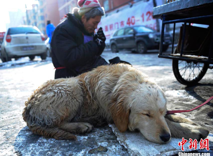 2月6日,在長春市一條繁華的街路上,一只小狗幫助身殘主人拉車賣冰糖葫蘆,成為長春冬日街頭一道感人的風景線。據(jù)主人介紹,雖然自己身殘且貧窮,但并不想靠別人救濟度日,因此學會了制作冰糖葫蘆的手藝,并以此自食其力。而他養(yǎng)的這條小狗“大黃”也是對主人不離不棄,每日都會幫助主人拉車外出謀生。圖為主人走累了抽根煙歇息的時候,小狗也在旁邊小憩一下。張瑤 攝