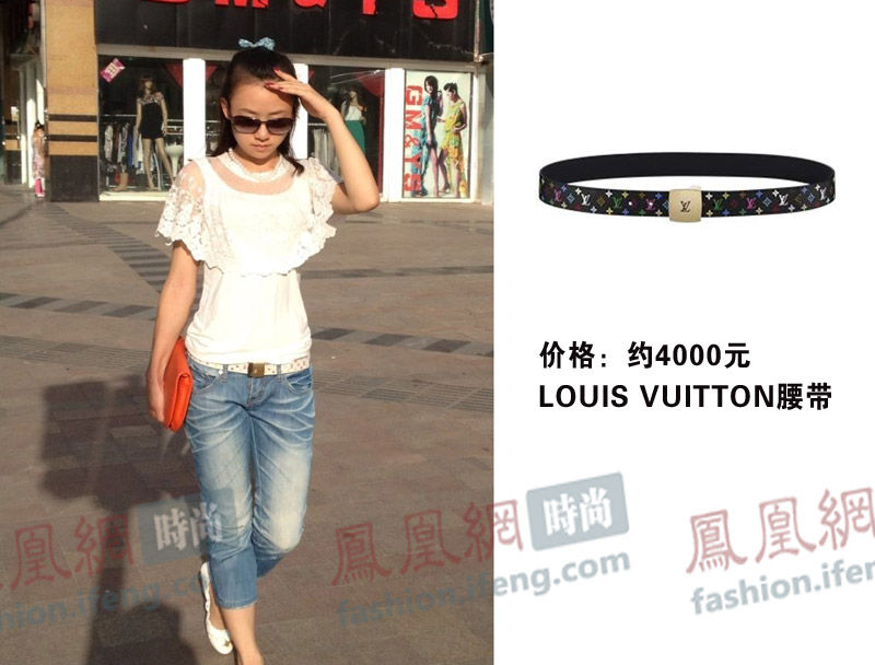 帆布質(zhì)料的LV腰帶。姑娘,拜托把頭上的頭花拿下來吧,土啊!
