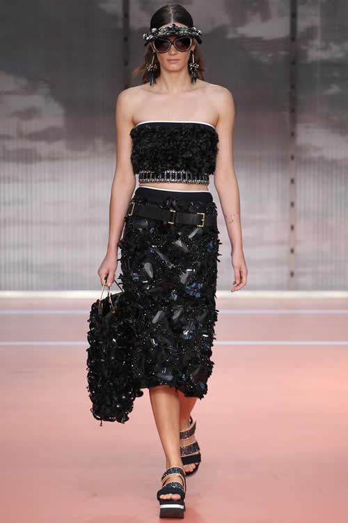 黑色立體花卉鋪滿抹胸上衣及鉛筆裙,黑色寶石渾然天成地灑落在花叢中,宛如暗夜里的點(diǎn)點(diǎn)星光,厚底拖鞋輕松地帶來一抹東方色彩。