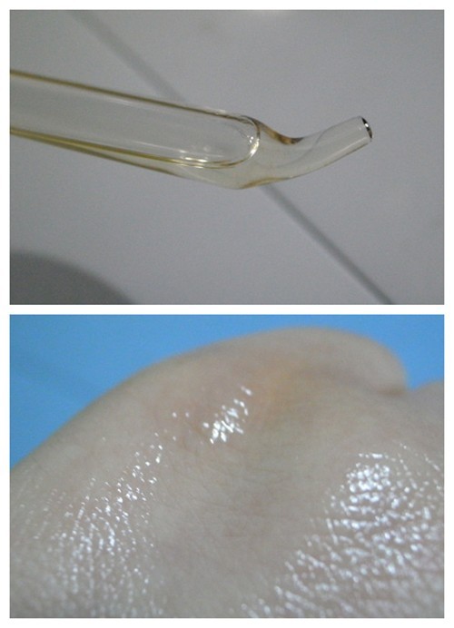 肌膚清潔之后,開始使用彼得羅夫維他命A晚間滋養(yǎng)精華液。PTR小藍(lán)瓶是水狀油質(zhì)的透明無味液體,滴在手背上極易擴(kuò)散,說明它的流動(dòng)性很強(qiáng)。稍加按摩,精華液便被完全吸收,滋潤但不黏膩,讓肌膚很有好感。