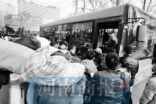 河南商報(bào)記者 鄧萬里/攝 不少返城農(nóng)民工下了長(zhǎng)途車來擠公交車
